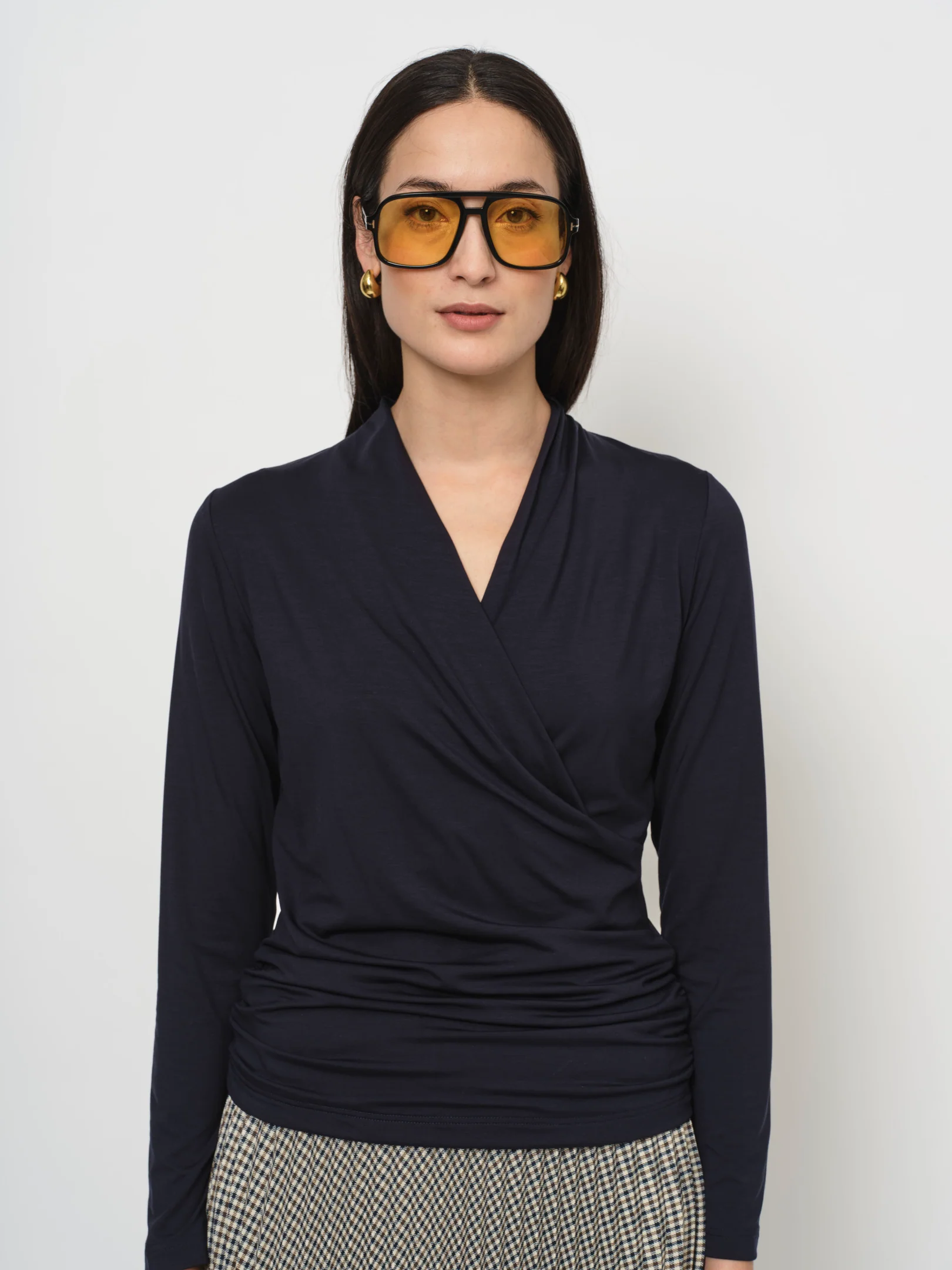 A feminine wrap design in a jersey fabric. This faux wrap top is both feminine and versatile. The jersey fabric ensures total comfort, while the narrow V-neckline is flattering. Slim-fitting body and sleeves. Fits true to size.
